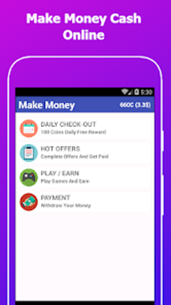 Make Money Online - Earn Money adalah aplikasi seluler yang memungkinkan pengguna untuk menghasilkan kredit dengan menyelesaikan tugas. Kredit ini kemudian dapat ditukar dengan uang sungguhan melalui PayPal.